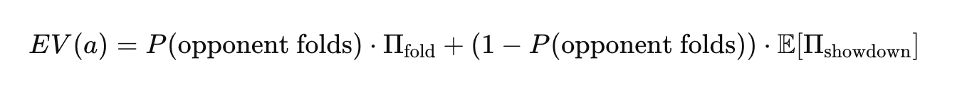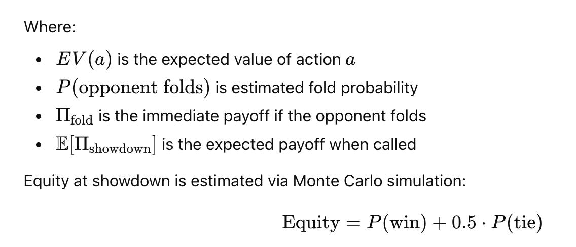 These inputs influence fold equity and risk–reward trade-offs. While intentionally simplified for interpretability, this structure reflects the core idea of Bayesian belief updating: decisions depend on posterior beliefs about opponent strategy.