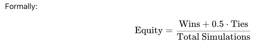 Equity is estimated using Monte Carlo simulation powered by combinatorial sampling of unseen cards. For each trial: