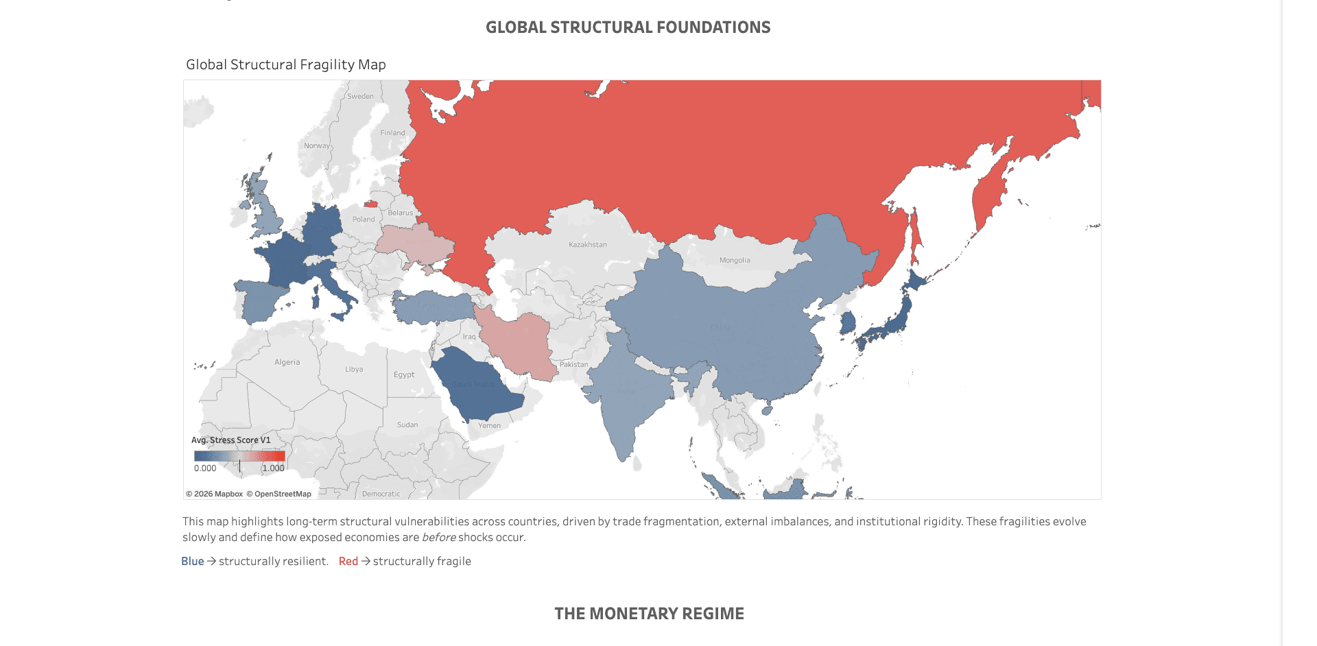This project builds a multi-layered dashboard to examine whether the global economic order is undergoing structural change. By integrating U.S. monetary regime shifts, global trade fragmentation, and country-level capital stress indicators, the analysis distinguishes cyclical volatility from deeper structural fragility. The framework classifies countries into risk regimes based on systemic exposure and real-time stress, offering a data-driven lens on how power, liquidity, and vulnerability are evolving across the global system.